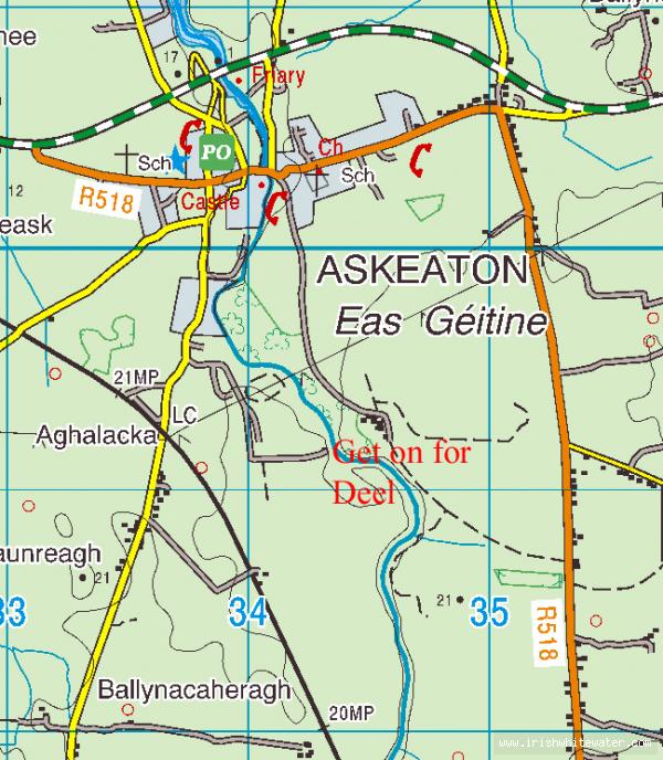 Travelling from Limerick on the N69, turn off for the town of Askeaton. Go through the town and over the bridge, turn left, travel along this road past the Aeroboard factory. Take the next turn left, sign posted "Deelside Stud", and follow the road upriver (you should see it from the road). Here you arrive at a farm. This is someone's private land, asking them nicely before driving through their property would be a good idea.