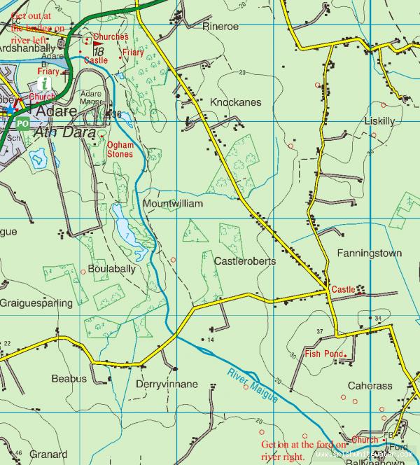The river is located near the town of Adare. Travelling from from Limerick towards Adare on the N21, take a left (first exit) at the first roundabout (small roundabout) after the dual carriage way ends. Travel along this road for approximately 5km, you will go around a sharp left bend followed by a sharp right bend. After these bends there is a turn right with a sign post for a restaurant, at the end of this road is the river. There is space for about five cars.