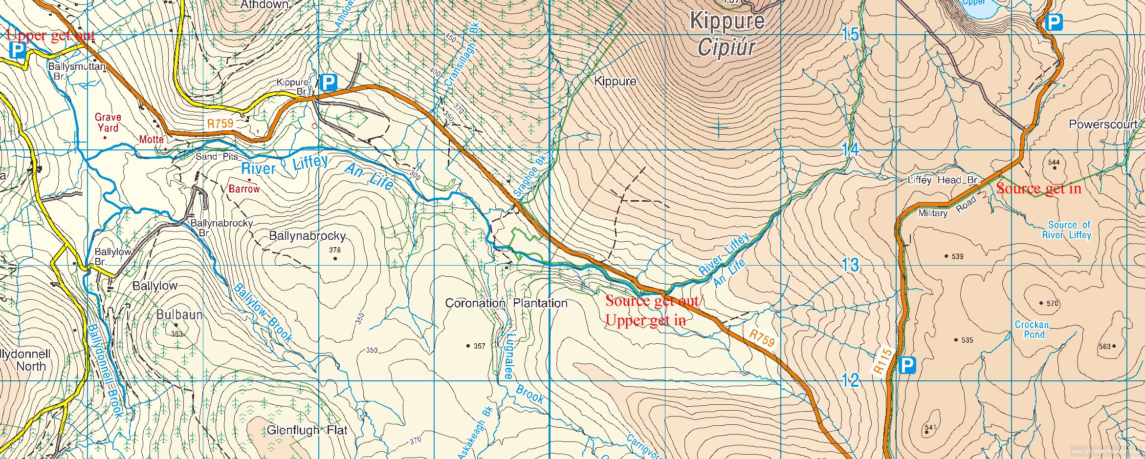 Take out is at Ballysmuttan bridge GR o(056,148) on the Manor Kilbride road. This road is the first left turn off the R759 7 km aprox. from the put-in. There is a lay-by on the right after the bridge. Caution: The Sally Gap road is known for break-ins, especially the put-in. Keeping valuables out of sight and parking in view of the road will help.