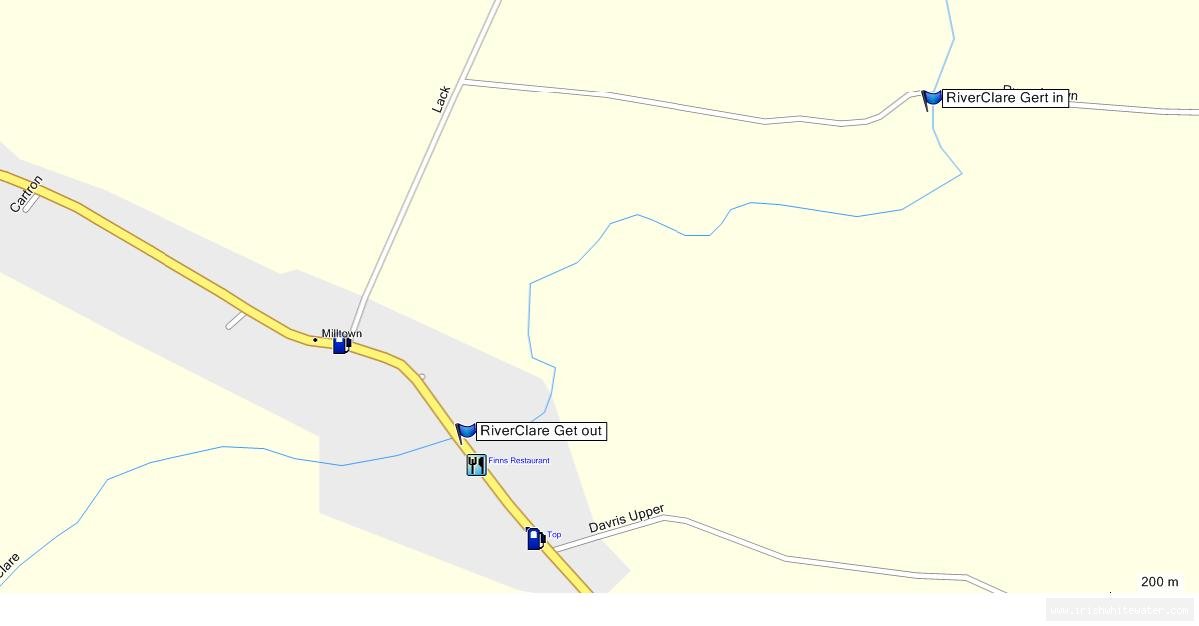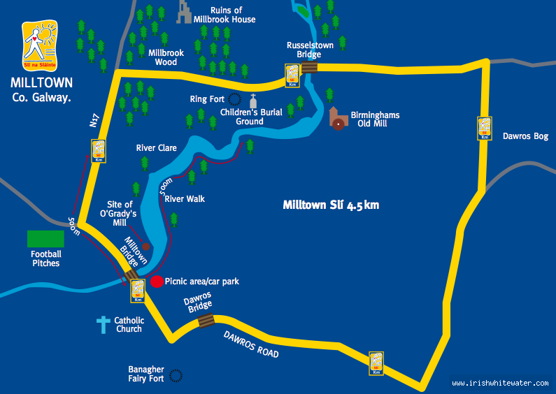 Mliltown Drive into Milltown from Mayo side, turn left at first turn, head up along road. Short run is get in on first right out of town, go down road for 200 metres and get in at bridge Long run keep going on the original road out of town, keep going for about 3 kilometres until you come to bridge. Get in on right after bridge. Get out is in Milltown village, at playgorund opposite church, can't miss it - by slide in centre of village beside their carpark.