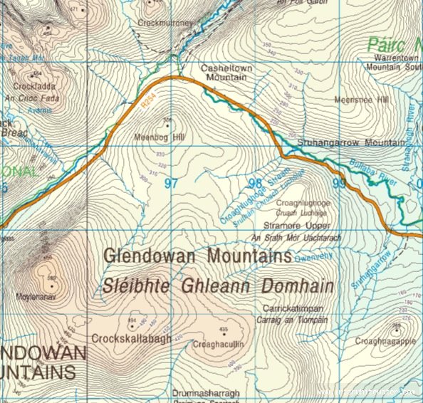 On the R254, coming from Letterkenny direction, as it passes through the Glendowan mountains with Glenveagh National park on its North. The river is about 1.5km up in the mountain and can seen as you drive NW along the left side of the road when there is lots of rain.
